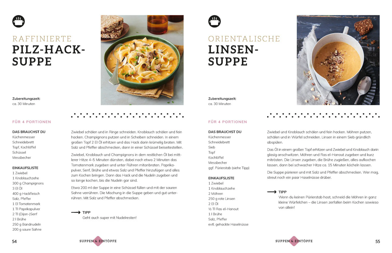 - Jede Menge nützliche Tipps: Grundausstattung an Vorräten, notwendige Küchenutensilien & Co.